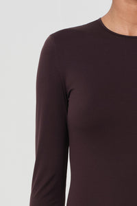 The Aura Long Sleeve Bodysuit in Chocolate is a dark brown crewneck made from a lightweight, second-skin fabric. Its sleek, form-fitting design offers a smooth silhouette, perfect for layering or wearing on its own.