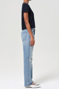 This authentic medium indigo jean features reworked destruction details for a raw, lived-in edge. Crafted from rigid regenerative cotton with a soft hand, the high-rise straight fit offers all-day comfort and a true-to-size silhouette. Style with a relaxed tee for an effortlessly cool look.