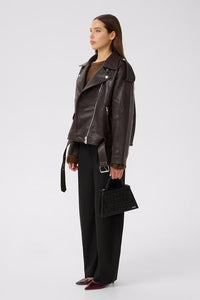 Crafted from genuine dark brown leather, the Gestuz Vida Jacket combines durability with timeless style. Its asymmetric zip closure and wide collar deliver a classic biker aesthetic, while zip pockets offer secure storage for essentials. Shoulder straps add a structured edge, and the adjustable waist belt ensures a personalized, flattering fit. This jacket is designed for those seeking both functionality and expert craftsmanship in their outerwear.