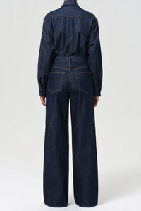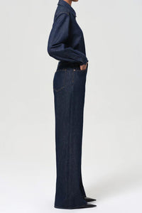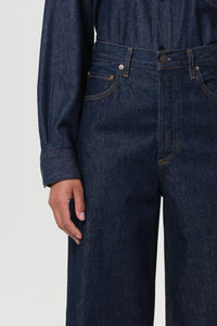The Dame Jean is a high-rise, full-length silhouette with a wide leg and clean, no-cuff finish. Cut from a rigid cotton blend that combines regenerative and recycled fibers, this dark indigo rinse offers a polished, minimalist look with a soft hand. Pair with crisp shirting or a fitted knit for effortless balance.