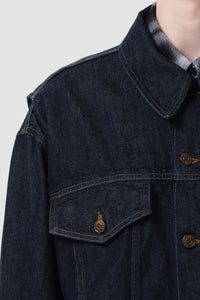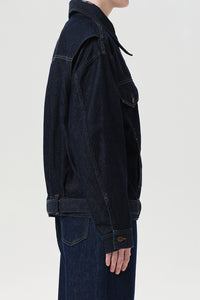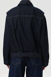 Looks Like: Clean dark rinse indigo denim jacket with optional belt and front pockets