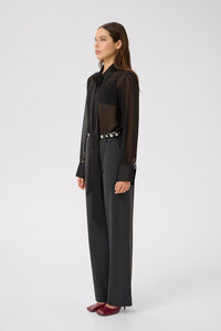 The Lynne Shirt showcases semi-sheer fabric that creates a light, delicate appearance. Its long sleeves finish with wide cuffs, providing a structured yet elegant silhouette. The shirt’s refined collar is adorned with a rose and a long tie ribbon, adding a sophisticated feminine touch to this expertly crafted piece.
