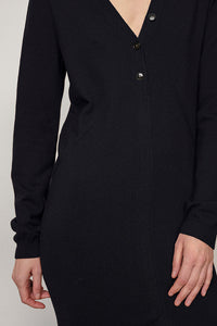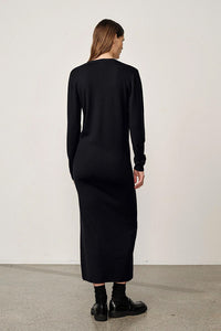The HERSKIND Graham Knit Dress in navy combines refined craftsmanship with contemporary design. This long-sleeve knitted dress features a deep V-neckline for an elegant silhouette, complemented by a functional front bottom closure that adds subtle detail. A high front slit enhances movement and modern appeal, making it an ideal choice for sophisticated day-to-night wear. Crafted for both comfort and style, this dress offers a versatile, polished look suitable for various settings.