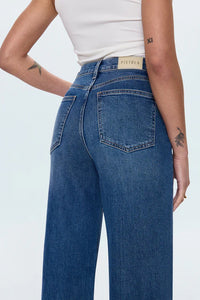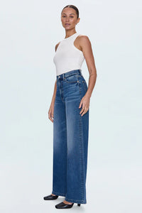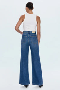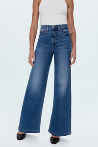 A relaxed, ultra wide leg silhouette with a high rise waist, full length leg, and a clean finished hem. Crafted from Pistola's signature comfort stretch denim to provide a structured shape with just the right give. Finished in an easy medium dark comfort stretch fabric, these jeans promise to be a versatile staple you'll reach for day after day, effortlessly transitioning from casual outings to dressier occasions