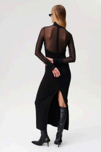 This fitted black dress features a sophisticated mock neck and refined cuff details for an elevated silhouette. Its back slit enhances movement, while the mesh panels with abstract cutouts add a contemporary edge. Designed to balance elegance with modern sophistication, it is ideal for upscale events or evening occasions.